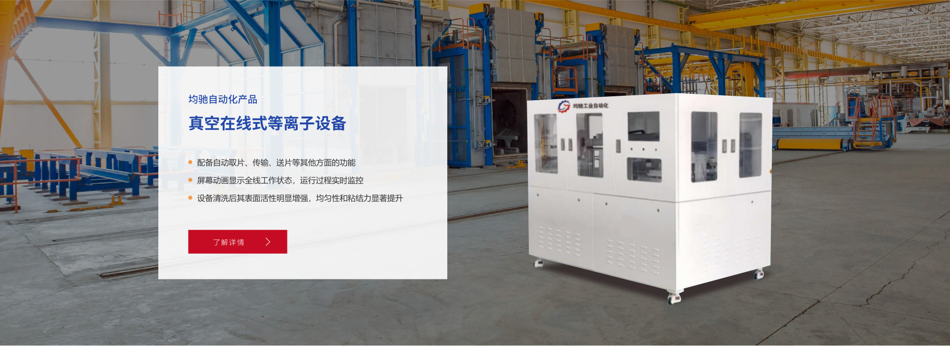 均馳工業自動化科技(蘇州)有限公司是行業領先的非標自動化設備,中高端智能工廠解決方案提供商,自公司成立以來,我們一直專注智能智造,以技術創新為中心,致力于3C電子、半導體、新能源動力電池、光伏、通信、汽車、紡織、印刷、生物醫療等行業提供服務。公司產品覆蓋PLASMA 清洗機、真空在線等離子清洗機、大氣等離子清洗機、寬幅等離子清洗設備、等離子表面處理設備、等離子除膠機、等離子刻蝕處理機、等離子電暈處理機等專業等離子清洗設備;均馳工業等離子處理設備對各類材料表面處理、活化、改性、蝕刻、除膠工藝中具有清洗材料表面有機物、提高材料表面親水性,改善材料表面附著力等優勢。